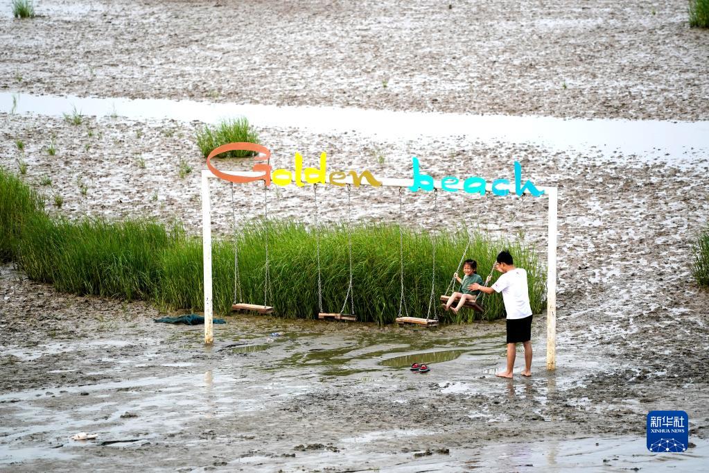 游人在江蘇省啟東市黃金海灘景區(qū)內(nèi)的黃海灘涂上休閑娛樂(2022年7月16日攝)。新華社記者 季春鵬 攝