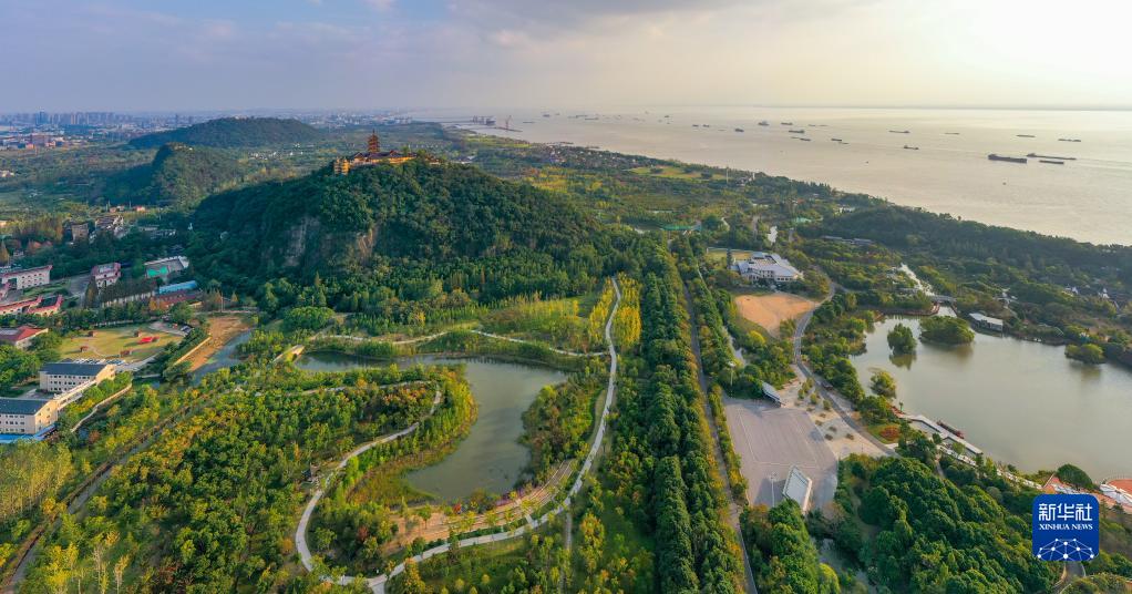 這是江蘇省南通市狼山國家森林公園沿江景色(2021年10月25日攝,無人機(jī)照片)。新華社記者 李博 攝