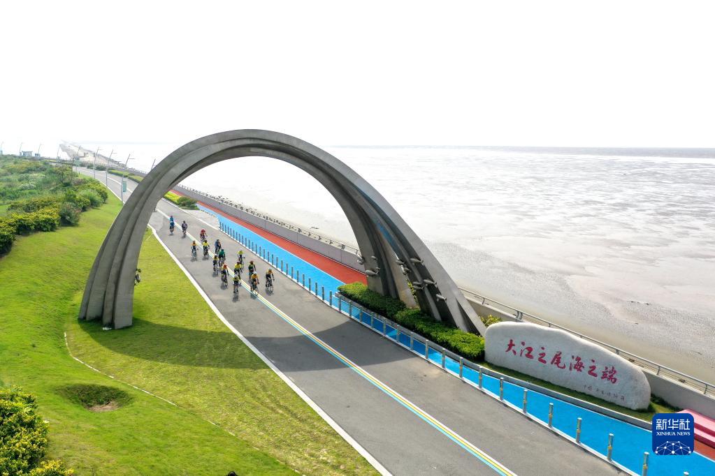 游人在江蘇省啟東市江海文化景觀大道騎行(2022年7月17日攝,無人機(jī)照片)。新華社記者 季春鵬 攝