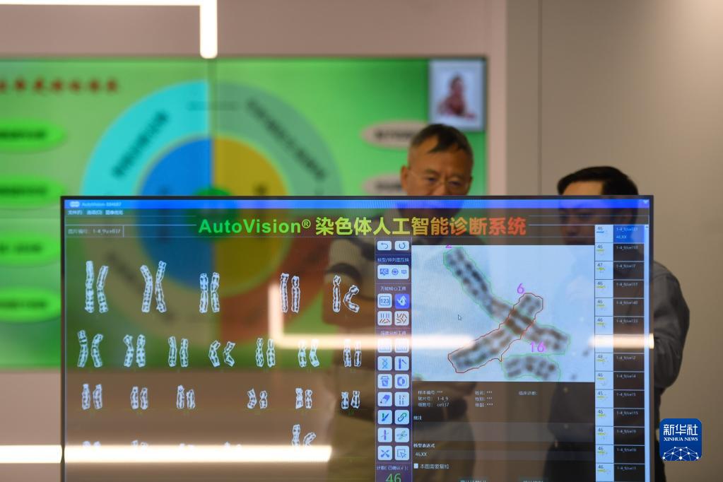 參加中國(杭州)數(shù)字·健康小鎮(zhèn)開園儀式的嘉賓在小鎮(zhèn)的成果轉(zhuǎn)化區(qū)了解一套染色體人工智能診斷系統(tǒng)(2020年8月30日攝)。新華社記者 黃宗治 攝