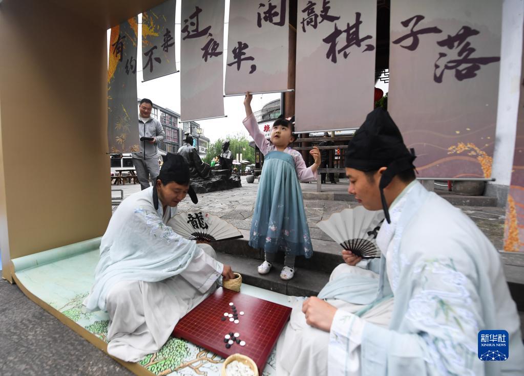 市民身著傳統(tǒng)服飾參加在浙江省建德市壽昌古鎮(zhèn)舉辦的傳統(tǒng)文化活動(2022年4月30日攝)。新華社記者 徐昱 攝