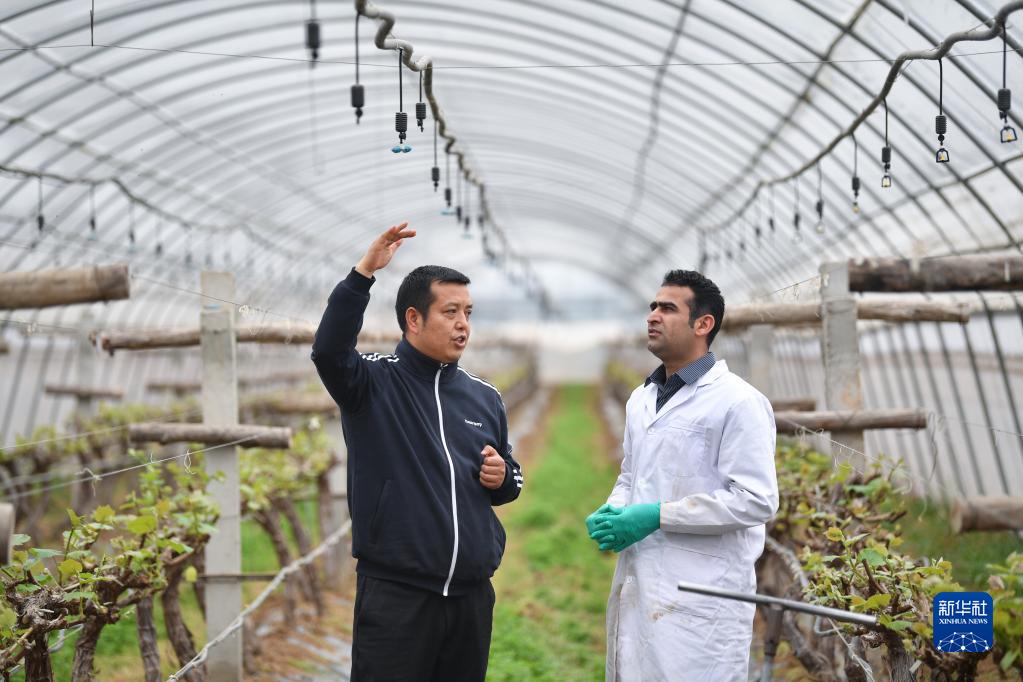 2021年3月17日,來自巴基斯坦的留學(xué)生(右)在陜西楊凌錦田農(nóng)業(yè)專業(yè)合作社向當(dāng)?shù)芈殬I(yè)農(nóng)民了解水肥一體化灌溉設(shè)備。新華社記者 張博文 攝