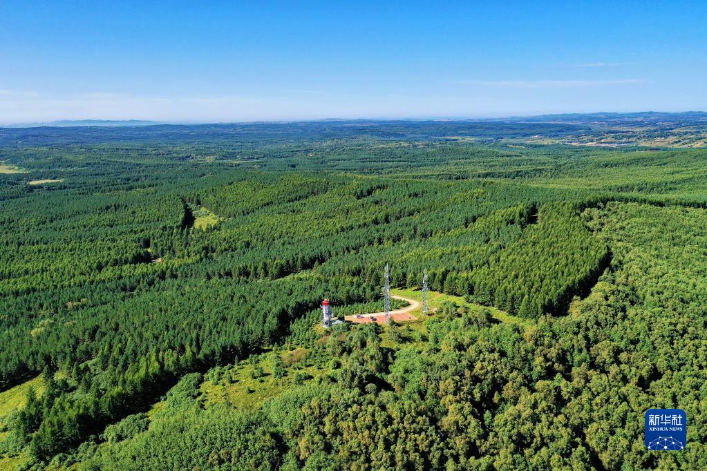 這是2021年8月23日拍攝的河北塞罕壩機(jī)械林場(chǎng)內(nèi)的望海樓(無人機(jī)照片)。三代塞罕壩林場(chǎng)人50多年堅(jiān)持植樹造林,用汗水澆灌出綠波涌動(dòng)的百萬畝人工林海。新華社記者 牟宇 攝