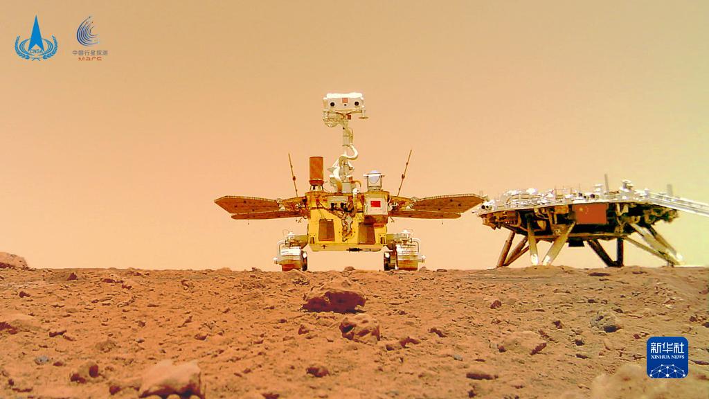 這是“著巡合影”圖。2021年6月11日,國(guó)家航天局在北京舉行天問(wèn)一號(hào)探測(cè)器著陸火星首批科學(xué)影像圖揭幕儀式,公布了由祝融號(hào)火星車拍攝的著陸點(diǎn)全景、火星地形地貌、“中國(guó)印跡”和“著巡合影”等影像圖。首批科學(xué)影像圖的發(fā)布,標(biāo)志著我國(guó)首次火星探測(cè)任務(wù)取得圓滿成功。 新華社發(fā)(國(guó)家航天局供圖)