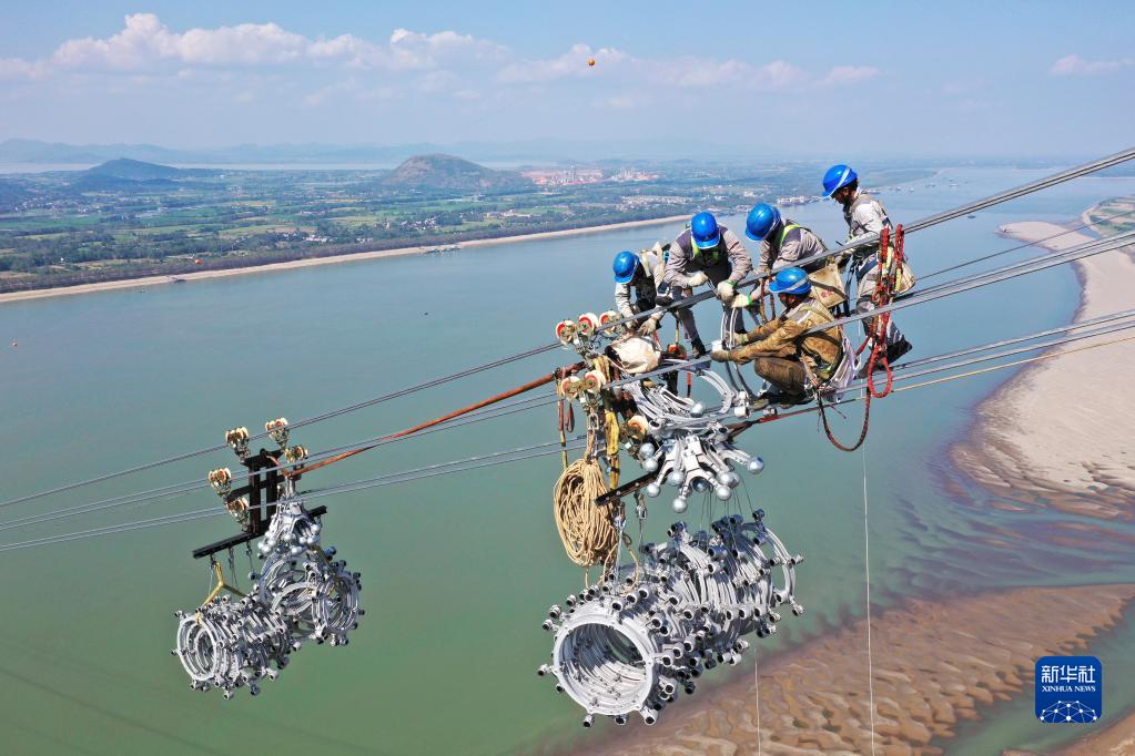 2022年9月16日,白鶴灘至浙江±800千伏特高壓直流輸電工程(白浙線)安徽段順利完成長(zhǎng)江大跨越放線作業(yè)。白浙線是我國(guó)實(shí)施“西電東送”戰(zhàn)略的重點(diǎn)工程(無(wú)人機(jī)照片)。 新華社發(fā)(趙獻(xiàn)富 攝)