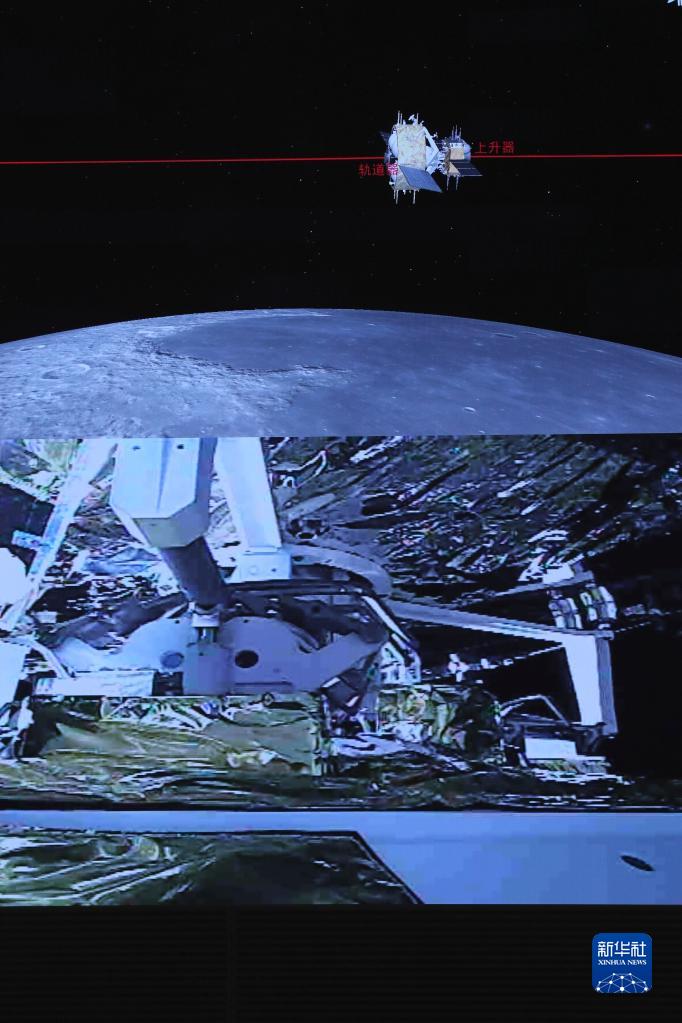 這是在北京航天飛行控制中心指揮大廳拍攝的嫦娥五號(hào)上升器與軌道器返回器組合體交會(huì)對(duì)接畫面(2020年12月6日攝)。新華社記者 金立旺 攝