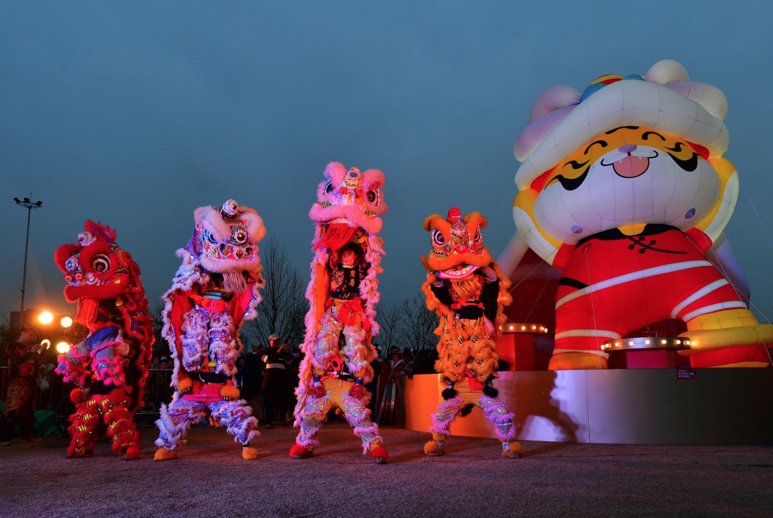 2月13日晚,武漢園博園、漢口里花燈璀璨、人聲鼎沸,眾多市民前來游園、觀燈、鬧元宵。圖為舞獅表演。長江日報記者李永剛 攝