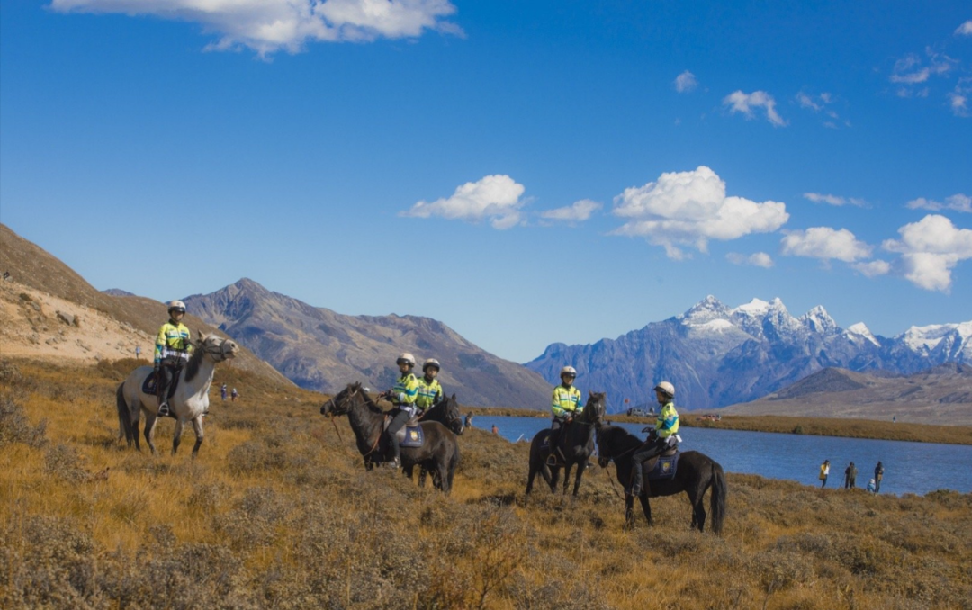 一隊(duì)英姿颯爽的女騎警,頭戴安全帽,身披反光執(zhí)勤服,腰佩執(zhí)法記錄儀和對(duì)講機(jī),腳踏摩托車踏板或馬鞍,成為國(guó)慶期間川藏線上...