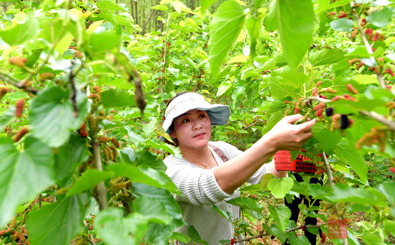 4月20日,赤壁市官塘驛鎮(zhèn)龍鳳山村碩果豐果業(yè)有限公司基地,游客正進(jìn)園采摘桑葚。