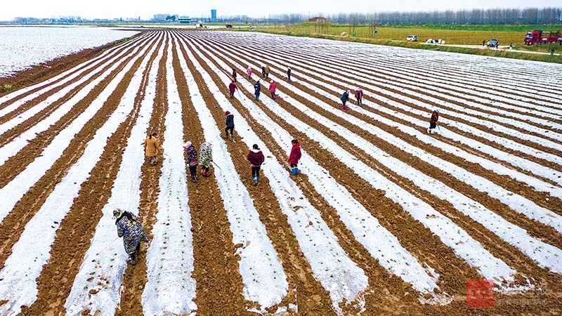3月23日,在湖北金潤農(nóng)業(yè)嘉魚平安州7250畝蔬菜基地上,春包綠油油,農(nóng)民們用鐵絲挑出保溫薄膜下面水果玉米苗,展現(xiàn)一幅人勤春...