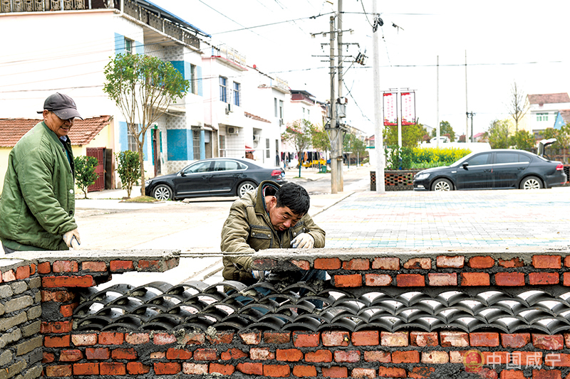 3月30日,嘉魚縣潘家灣鎮(zhèn)肖家洲村陳家堡休息文化廣場,泥瓦工正用黑瓦砌墻。
