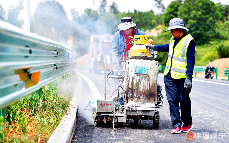圖②:5月2日,咸寧大道西延伸線,施工人員正在施劃交通標(biāo)線,為通車做最后準(zhǔn)備。