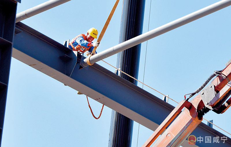 1月19日,咸安經(jīng)濟(jì)開發(fā)區(qū)綠色智能制造孵化園一期項(xiàng)目基地, 2棟鋼結(jié)構(gòu)廠房已建成, 5棟框架結(jié)構(gòu)樓正在焊接廠房房頂。
