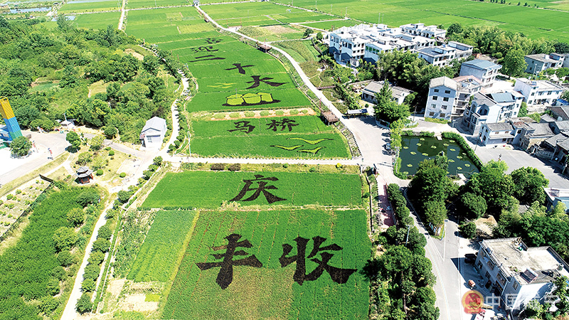 8月9日,航拍下的咸安區(qū)馬橋鎮(zhèn)曾鋪村建國(guó)畈,用彩色水稻種植出的“喜迎二十大 慶豐收”等圖案字樣分外醒目。
