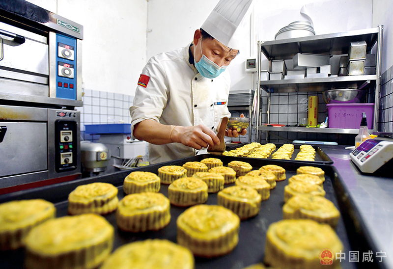 9月9日,咸安區(qū)桂花鎮(zhèn)柏墩街“東海蛋糕店”,店主雷武東正在趕制中秋月餅。