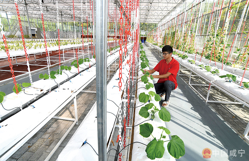 9月18日,在嘉魚(yú)縣湖北谷神科技有限責(zé)任公司人工智能品種比較試驗(yàn)系統(tǒng)和果蔬栽培技術(shù)實(shí)驗(yàn)室,科研人員正在察看基質(zhì)栽培黃瓜的長(zhǎng)勢(shì)。