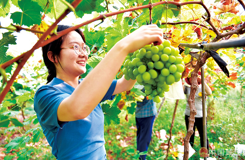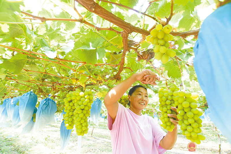 15日,咸安區(qū)賀勝橋鎮(zhèn)賀勝村夢情谷農(nóng)業(yè)生態(tài)園,種植戶汪利珍試種的12畝陽光玫瑰葡萄進入豐收期。