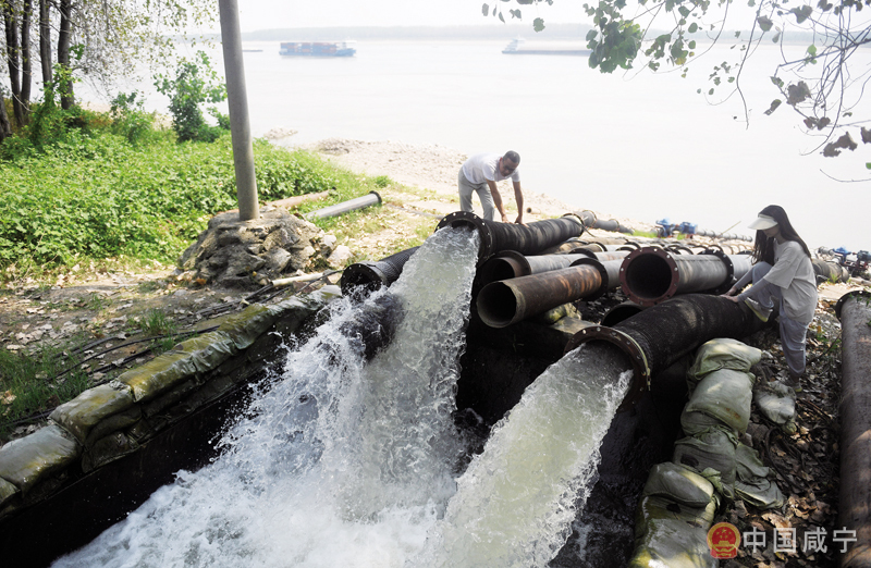 13日,嘉魚(yú)縣簰洲灣鎮(zhèn)河埠泵站,當(dāng)?shù)馗扇簭拈L(zhǎng)江提水灌溉農(nóng)田。