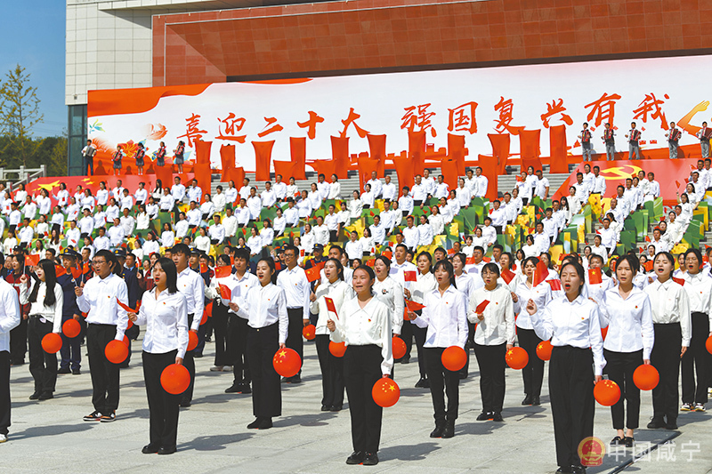 10月10日,咸安文體中心廣場(chǎng),來(lái)自該區(qū)的學(xué)生、區(qū)直單位干部職工以及鄉(xiāng)鎮(zhèn)辦場(chǎng)代表近千人,一起合唱《前進(jìn)吧,中國(guó)共產(chǎn)黨》。