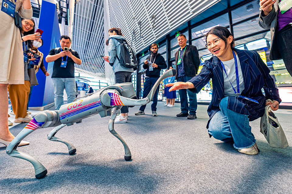 11月7日,2023年世界互聯(lián)網(wǎng)大會“互聯(lián)網(wǎng)之光”博覽會在浙江省嘉興市桐鄉(xiāng)市烏鎮(zhèn)啟幕,圖為觀眾在博覽會上與仿生四足機器人互動。