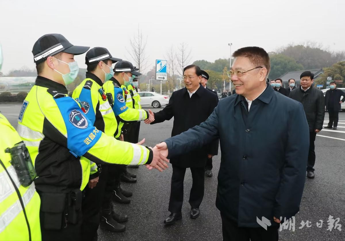 王蒙徽、王忠林來(lái)到武昌區(qū)交通大隊(duì)東湖梨園崗,看望慰問(wèn)正在執(zhí)勤的交警,與他們一一握手,并向奮戰(zhàn)在一線的廣大交警致以新春祝福。