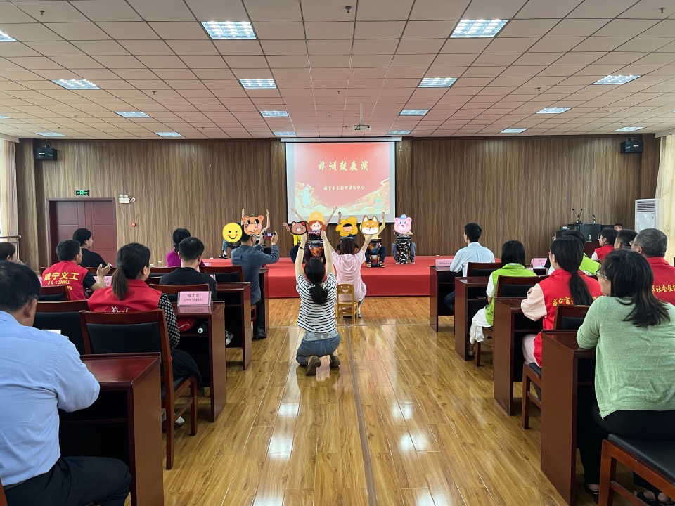 咸寧市職工葫蘆絲巴烏協(xié)會(huì)、咸寧市武術(shù)協(xié)會(huì)、咸寧市中老年京劇社、咸寧市琵琶協(xié)會(huì)為孩子們獻(xiàn)上了精彩的演出。其中的9名兒童為大家?guī)砹恕斗侵薰摹返谋硌?,大膽的表現(xiàn)、自信的動(dòng)作和開心的笑臉感染了在場的每一個(gè)人,搏得大家熱烈掌聲。