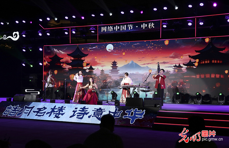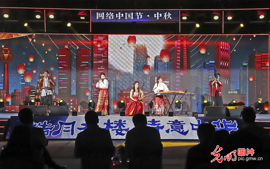 9月27日晚,“皓月名樓 詩意中華”2023年網(wǎng)絡(luò)中國節(jié)·中秋賞月直播活動現(xiàn)場,表演民樂串燒《秋風(fēng)起月滿樓》。(劉銘攝/光明圖片)