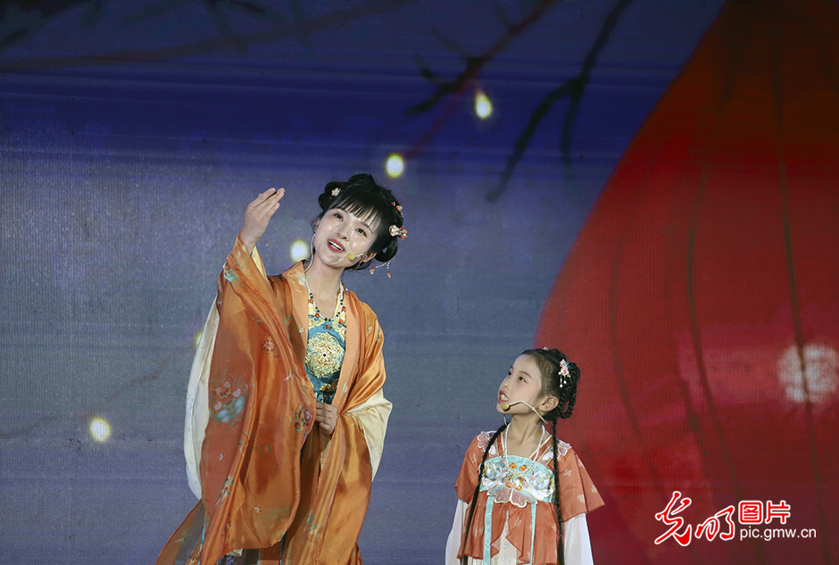9月27日晚,“皓月名樓 詩意中華”2023年網(wǎng)絡(luò)中國節(jié)·中秋賞月直播活動現(xiàn)場,小一姐姐(浙江工業(yè)大學(xué)教師)和女兒小團子表演創(chuàng)意音詩畫《滕王閣》。(楊紫韜攝/光明圖片)