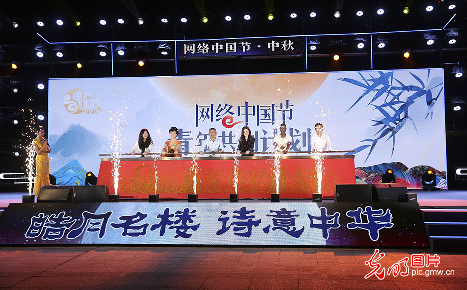 9月27日晚,“皓月名樓 詩意中華”2023年網(wǎng)絡(luò)中國節(jié)·中秋賞月直播活動現(xiàn)場,“網(wǎng)絡(luò)中國節(jié)”青年共創(chuàng)計劃發(fā)布儀式。(喻云亮攝/光明圖片)