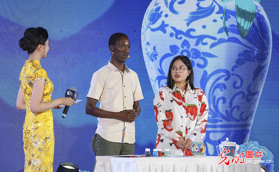 9月27日晚,“皓月名樓 詩意中華”2023年網(wǎng)絡(luò)中國節(jié)·中秋賞月直播活動現(xiàn)場,羅伯特(烏干達)石家恩(洪都拉斯)文化分享《我的中國節(jié)》。(楊紫韜攝/光明圖片)。