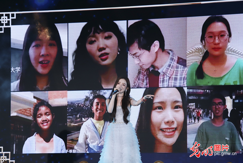 9月27日晚,“皓月名樓 詩意中華”2023年網(wǎng)絡(luò)中國節(jié)·中秋賞月直播活動現(xiàn)場,戴羽彤中外青年學(xué)子代表合唱《但愿人長久》。(劉銘攝/光明圖片)