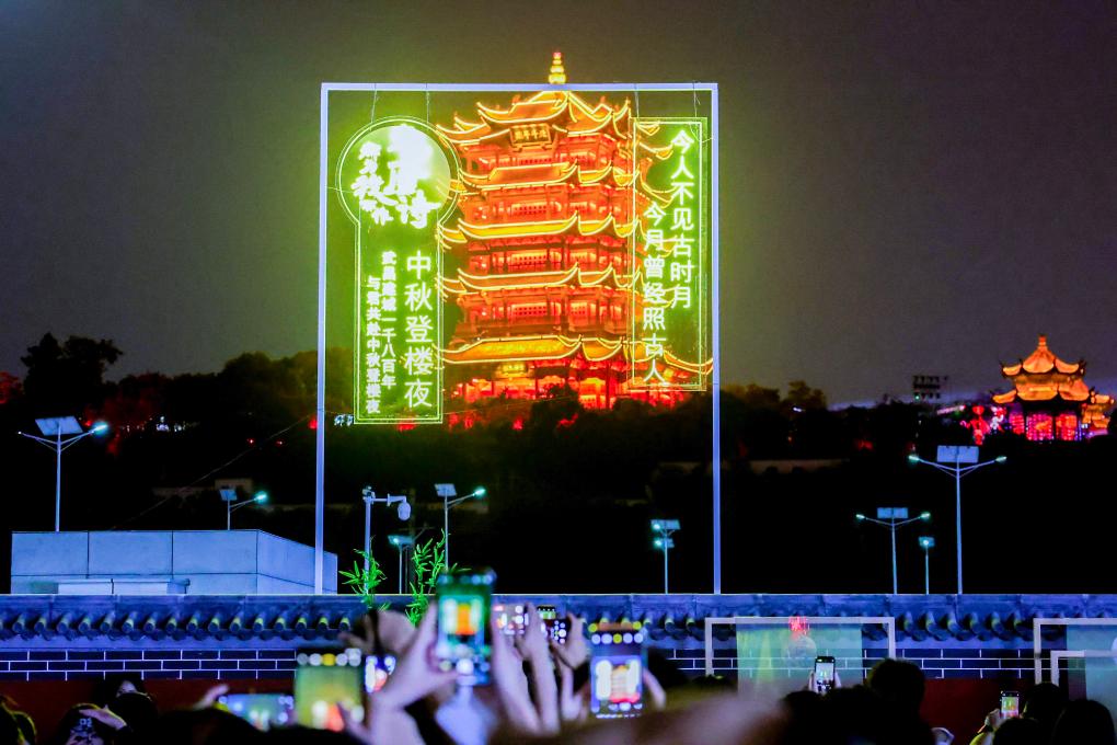 “今人不見古時(shí)月,今月曾經(jīng)照古人?!?月29日中秋節(jié)當(dāng)晚,武漢司門口黃鶴樓地鐵站的C出口人頭攢動(dòng)。由這個(gè)夜賞黃鶴樓“最佳拍攝機(jī)位”抬眼望去,青瓦朱墻之上,寫著李白千古名句的燈光裝置流光溢彩,與遠(yuǎn)處蛇山之上、燈火璀璨的黃鶴樓交相輝映,現(xiàn)代科技與傳統(tǒng)文化碰撞而生的奇景引得游人紛紛駐足、留影。