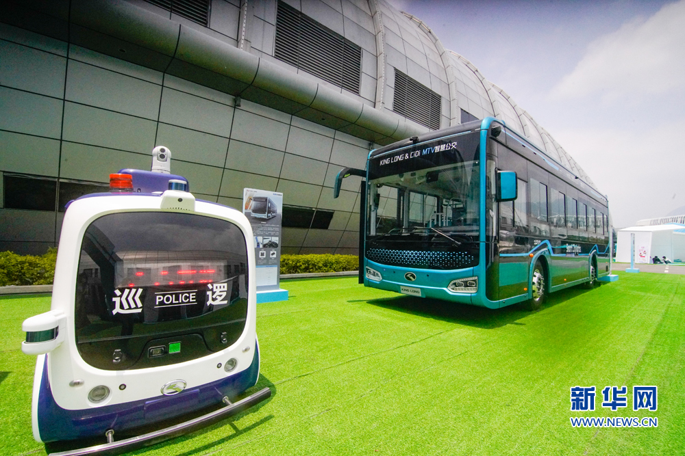 展館外圍展示的智慧公交和自動駕駛安防車?!⌒氯A網(wǎng) 蔣巧玲 攝