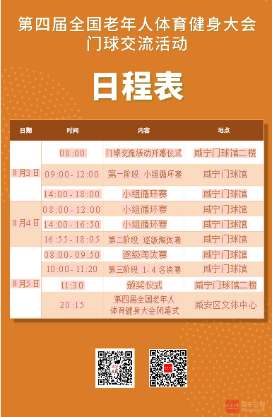 據(jù)介紹,第四屆全國老健會設(shè)有14個比賽項目,分別在全國14個城市舉行,其中門球交流活動在咸寧舉行;同時,第四屆全國老健會開幕式已于4月25日在四川瀘州舉行,閉幕式以及中老體協(xié)第七屆會員大會將在咸寧舉辦。