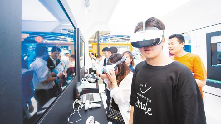 游客在中國電信展廳內(nèi)體驗VR設(shè)備。