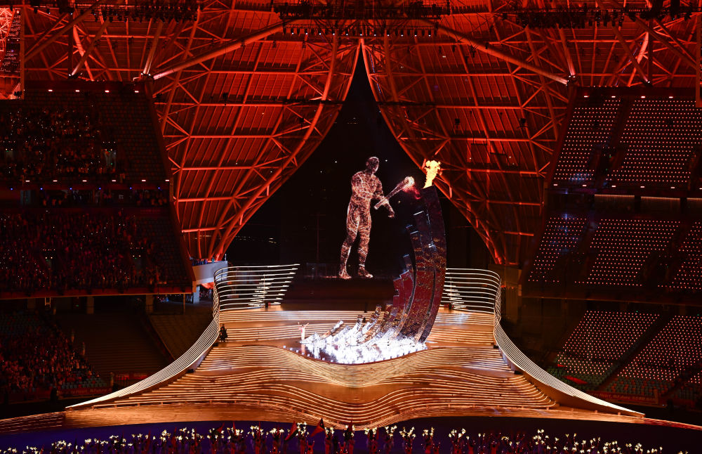 9月23日,最后一棒火炬手汪順和“數(shù)字火炬手”在第19屆亞洲運(yùn)動(dòng)會(huì)開幕式上點(diǎn)燃主火炬。新華社記者 胡虎虎 攝