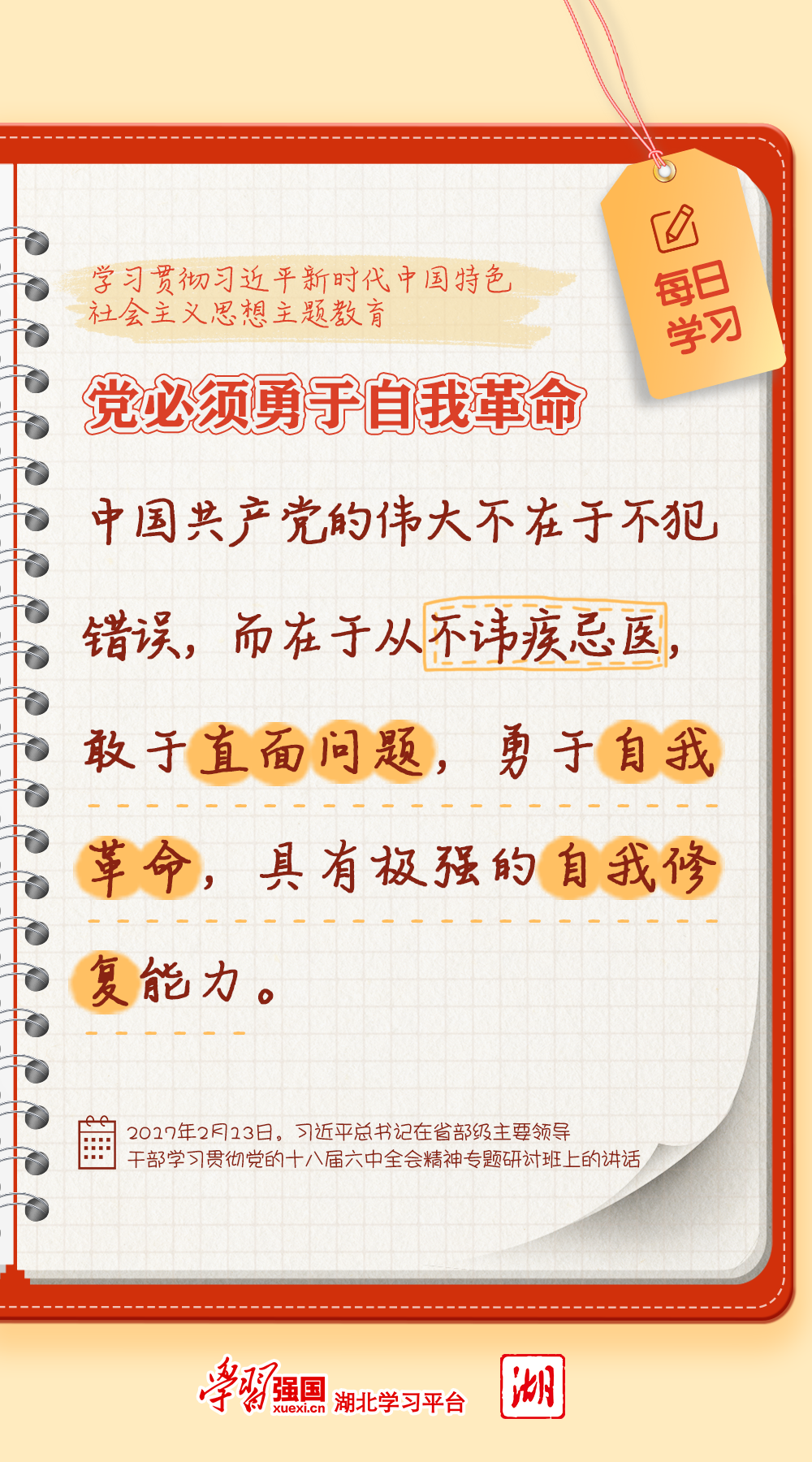 2017年2月13日,習(xí)近平總書記在省部級主要領(lǐng)導(dǎo)干部學(xué)習(xí)貫徹黨的十八屆六中全會精神專題研討班上的講話中指出,黨必須勇于自我革命。