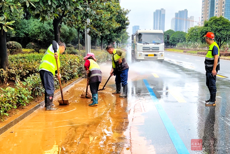 全力以“復(fù)”,水退街凈。7月2日上午,市中心城區(qū)金桂路始峰悅府路段,市城管執(zhí)法委組織環(huán)衛(wèi)工人對(duì)退水后的路面進(jìn)行全面清洗,保證車輛、行人順利通行?!∮浾摺£愭骸⊥ㄓ崋T 張冰 攝