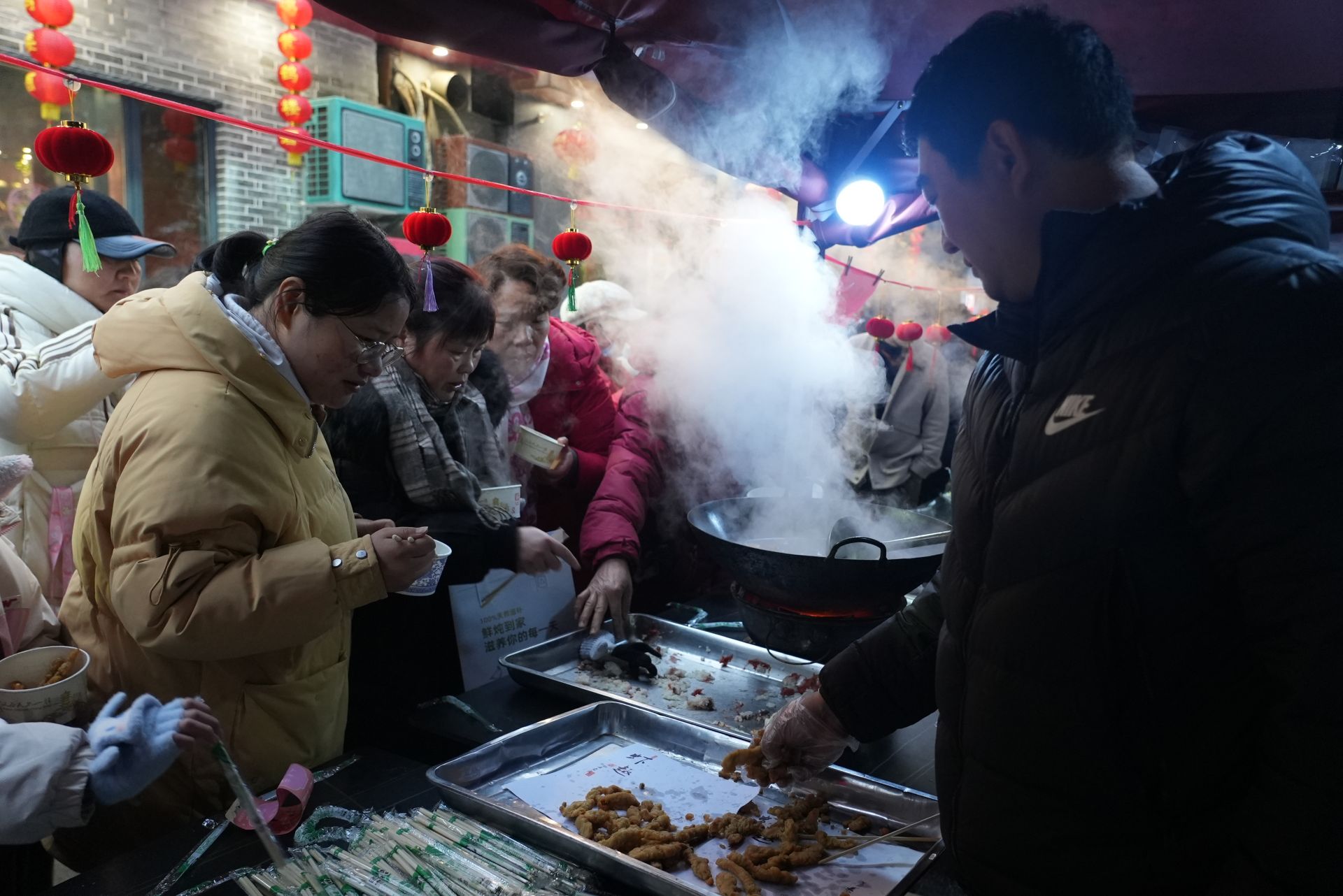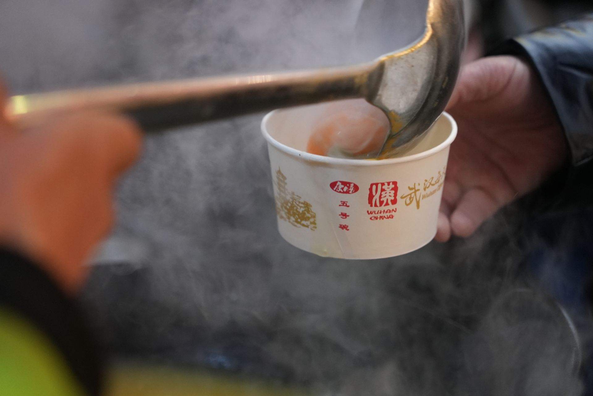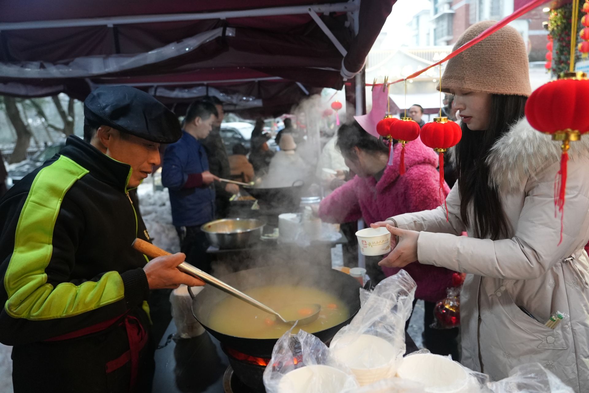 在舞臺的不遠(yuǎn)處,湯圓、八寶飯、小酥肉、水煮丸子等應(yīng)景傳統(tǒng)美食一字排開,“免費(fèi)試吃”的招牌底下吸引了不少市民前來圍觀。一碗碗熱氣騰騰的湯圓端到大家手中時,升騰的煙火氣,是團(tuán)團(tuán)圓圓的幸福時光。