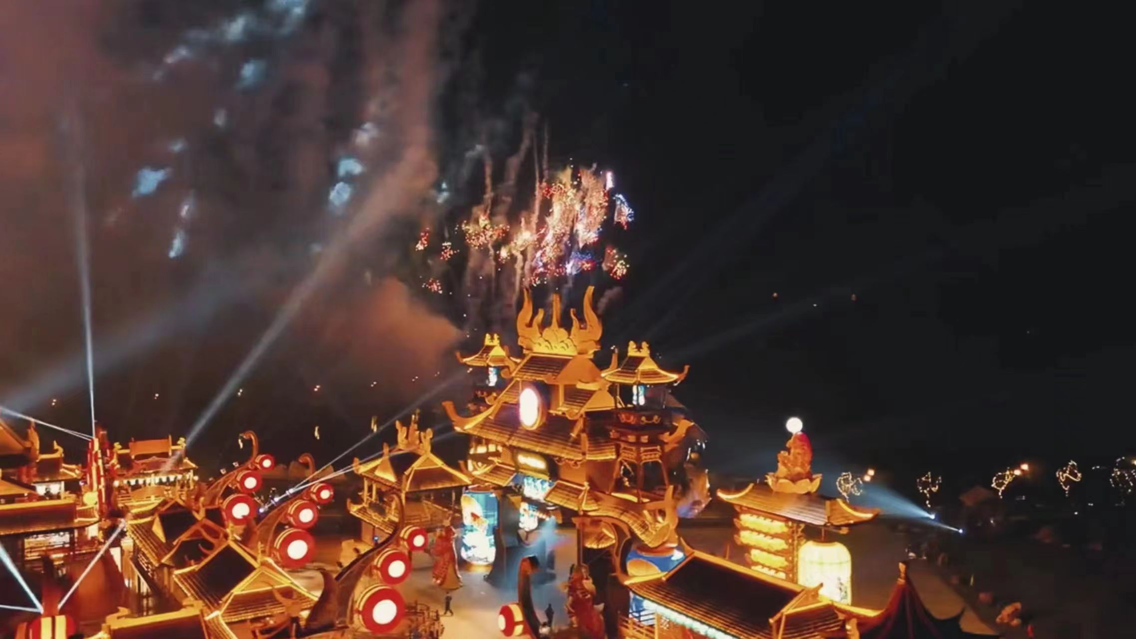 豬八戒背媳婦、女兒國招親、智斗蝎子精等經(jīng)典故事真人演繹,孫悟空、牛魔王、金翅大鵬鳥等各種耳熟能詳?shù)纳裨捜宋镙喎料?,川劇變臉、煙花秀等精彩?jié)目引得眾人歡呼不斷……全場陷入了歡樂的海洋。