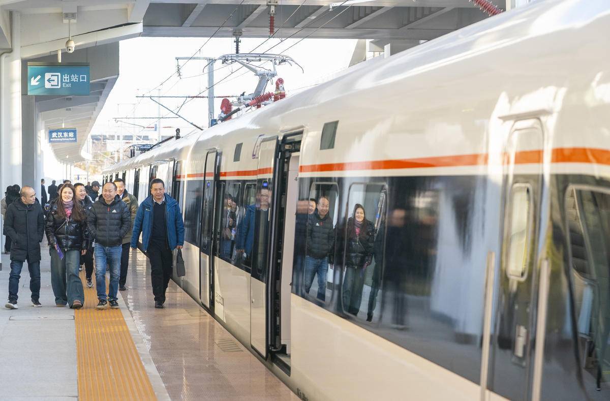 1月24日,武漢東站站臺(tái),一列嶄新的“新城快線”列車(chē)即將駛出。?。ê比?qǐng)?bào)全媒記者 魏錸 通訊員 張璨龍 趙倩 攝)