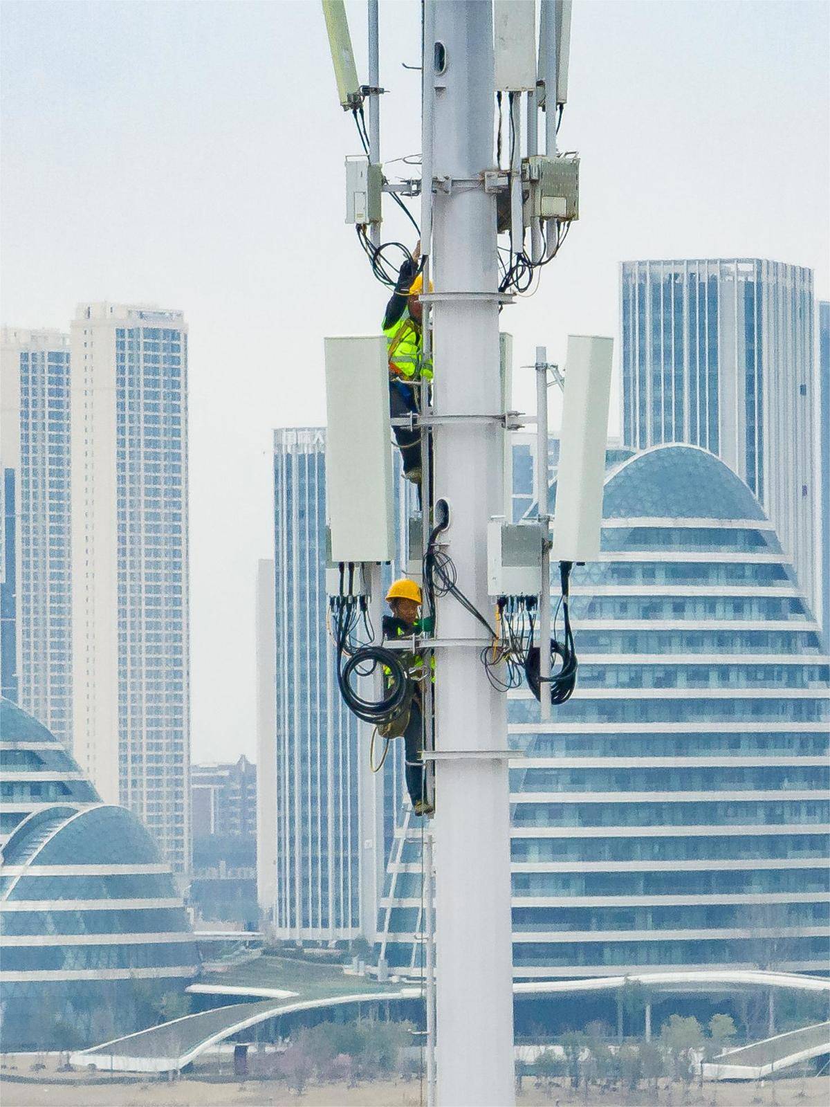 今年2月16日,武漢經(jīng)開區(qū),工作人員在高空作業(yè),安裝5G基站設(shè)備。(湖北日?qǐng)?bào)全媒記者 柯皓 通訊員 王政 鮑秦 攝)