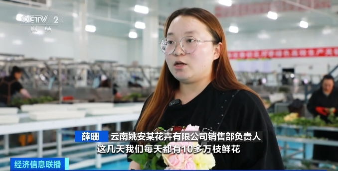 云南姚安某花卉有限公司銷售部負(fù)責(zé)人 薛珊:從上個(gè)月27日開始,玫瑰花的需求量就大了起來(lái),這幾天我們每天都有10多萬(wàn)枝鮮花運(yùn)往斗南花市,日均產(chǎn)值在12萬(wàn)元左右。
