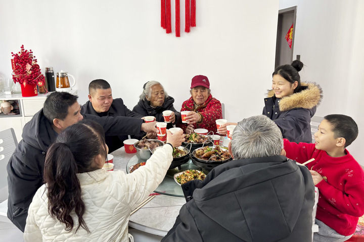 ??2025年1月28日,湖南省華容縣團洲鄉(xiāng)團洲新村居民在新家吃團圓飯過大年。新華社發(fā)(吳巍偉 攝)