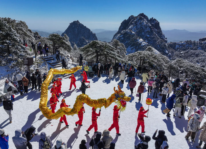 ??2025年1月27日,民俗舞龍隊在雪后的安徽省黃山風(fēng)景區(qū)光明頂表演(無人機照片)。新華社發(fā)(施亞磊攝)