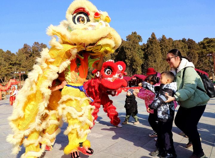 ??2025年1月28日,在河南南陽臥龍崗文化園內(nèi),市民欣賞舞獅表演。新華社發(fā)(高嵩攝)