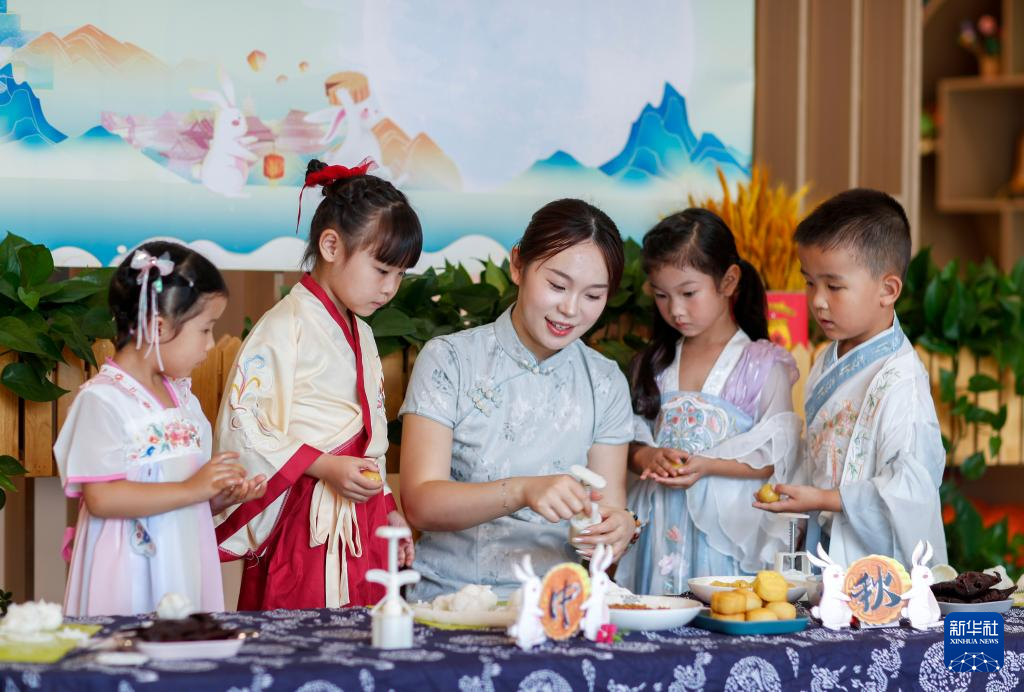 9月8日,在江蘇省興化市文林幼兒園,小朋友在老師的指導(dǎo)下學(xué)習(xí)做月餅。