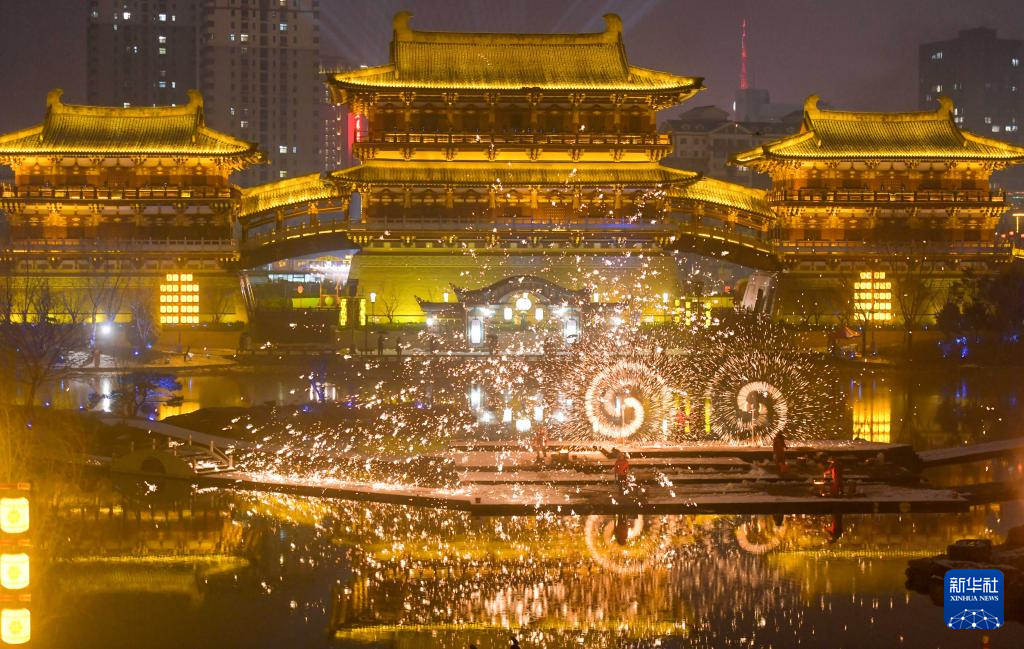 1月25日,表演者在河南省洛陽(yáng)市隋唐洛陽(yáng)城九洲池景區(qū)展示打鐵花。