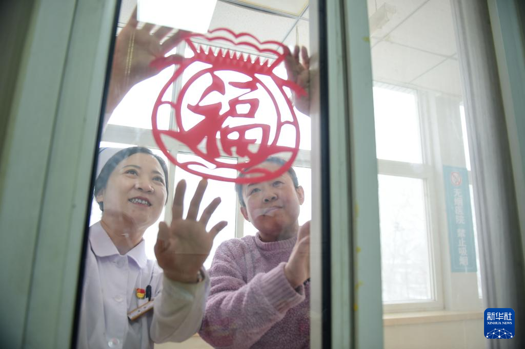 1月26日,河北省滄州市第三醫(yī)院的醫(yī)務(wù)人員與患者一起貼福字。