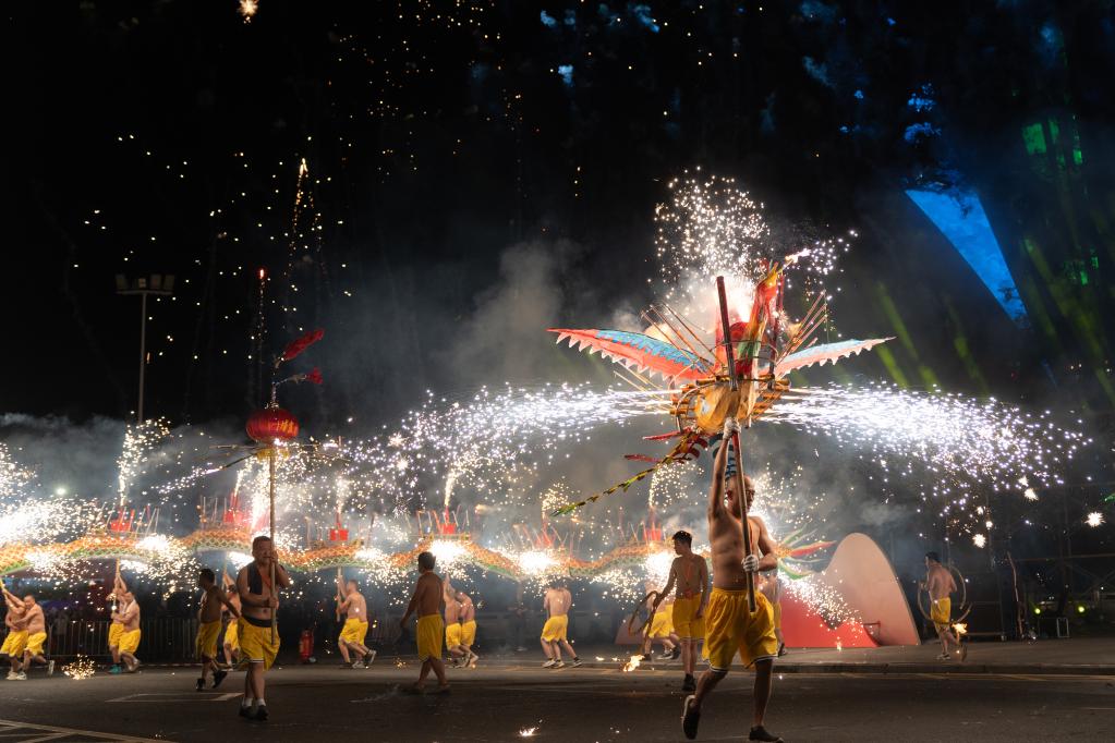 ??夜幕降臨,點(diǎn)燃觀眾熱情的不僅只有英歌舞。在客家文化的重要發(fā)源地梅州,埔寨火龍表演現(xiàn)場(chǎng)火光沖天,龍影翻騰。